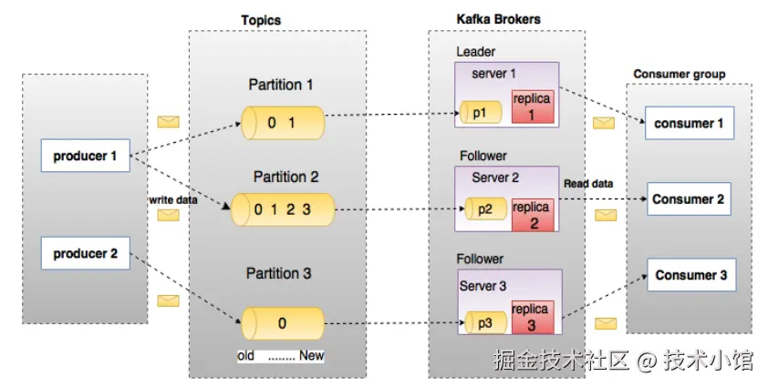 - 副本机制:每个分区的领导者副本负责处理生产者的写入请求和消费者的读取请求。跟随者副本会从领导者副本同步数据,确保副本的数据一致性。