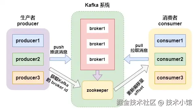 - ZooKeeper 角色:Kafka 使用 ZooKeeper 来管理 Broker 节点的元数据,例如记录 Broker 节点的状态、协调分区副本的选举、检测节点失效等。