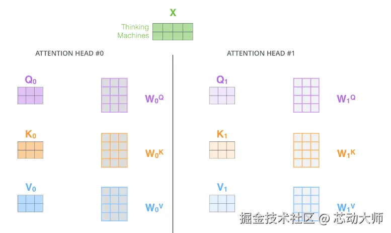 论文还提出了Multi-Head Attention的概念。其实很简单,前面定义的一组Q、K和V可以让一个词attend to相关的词,我们可以定义多组Q、K和V,它们分别可以关注不同的上下文。计算Q、K和V的过程还是一样,不过现在变换矩阵从一组(𝑊𝑄,𝑊𝐾,𝑊𝑉)变成了多组(𝑊𝑄0,𝑊𝐾0,𝑊𝑉0) ,(𝑊𝑄1,𝑊𝐾1,𝑊𝑉1)。如下图所示。