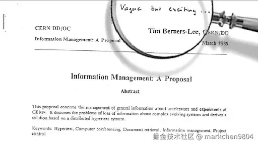 然而,Berners-Lee 在解释他的想法时遇到了一些困难。他从来都不是一个善于简介表述自己想法的人。截至他在 1989 年写下了“信息管理,一个提案”时,Berners-Lee 已然有了全球化的野心。然而,这份文档长达数千字,其中充满了图表和示意图。它还没有解释清楚刚刚提到的内容,就直接跳向了下一个想法。虽然提案中包含了许多最终成为了万维网的内容,但这个想法实在是太大了。最终它得到了一个不冷不热的回应——一条写在文件页头的“模糊,但令人兴奋”的评价。