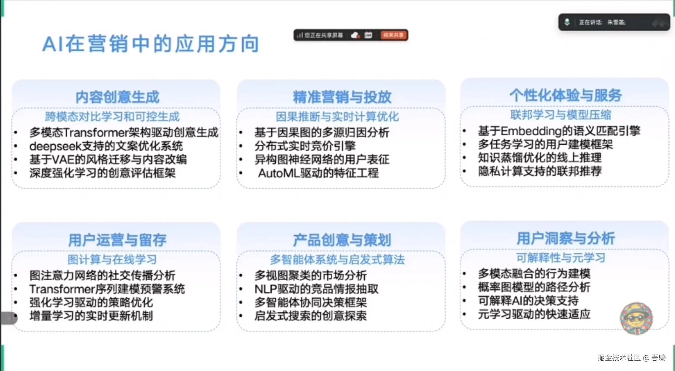 总结DeepSeek支持的AI营销技术方向,包括内容创意生成、精准投放、个性化服务、用户洞察等,覆盖从策略制定到执行优化的全链路闭环。