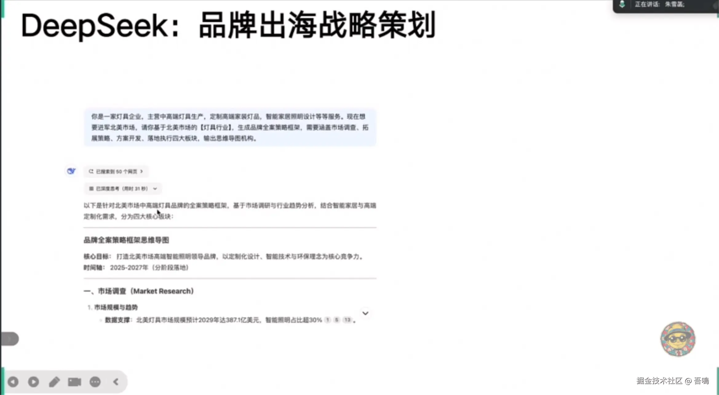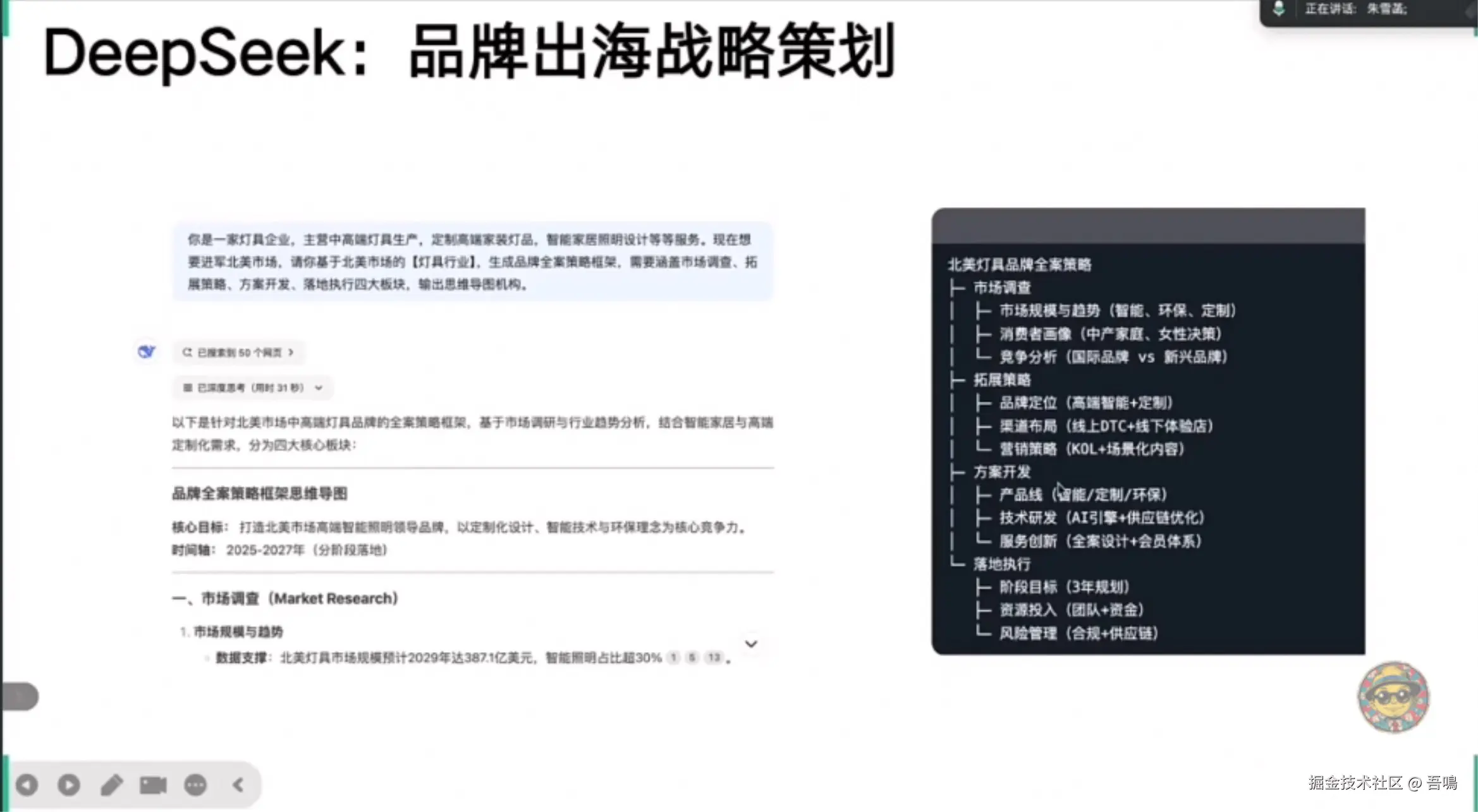 阐述DeepSeek如何提升营销效率,包括自动化内容生成、个性化推荐、多渠道适配、创意探索等。具体案例涵盖市场调查(虚拟用户建模、多模态数据合成)、品牌出海策略(灯具行业全渠道布局)及社交媒体运营(小红书文案批量生成、抖音脚本设计)。 - 虚拟人与数字技术应用
