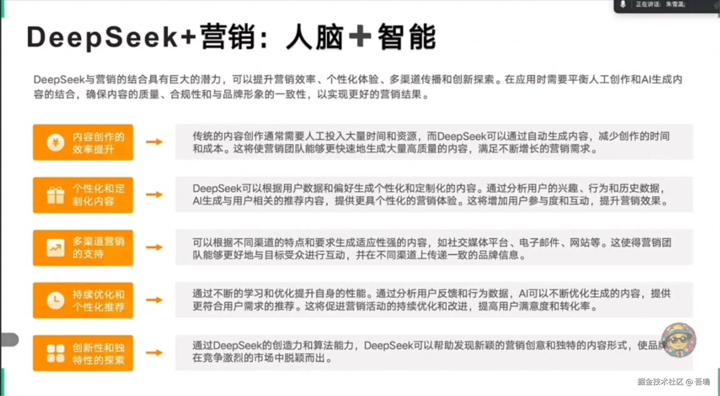 分析传统媒体时代营销的局限性(单向传播、效果难衡量),对比智媒时代基于社交平台、UGC、KOL/KOC的互动式营销,强调用户参与和个性化传播的优势,并以GoPro和小红书为例说明UGC与社交化营销的价值。 - DeepSeek的营销应用