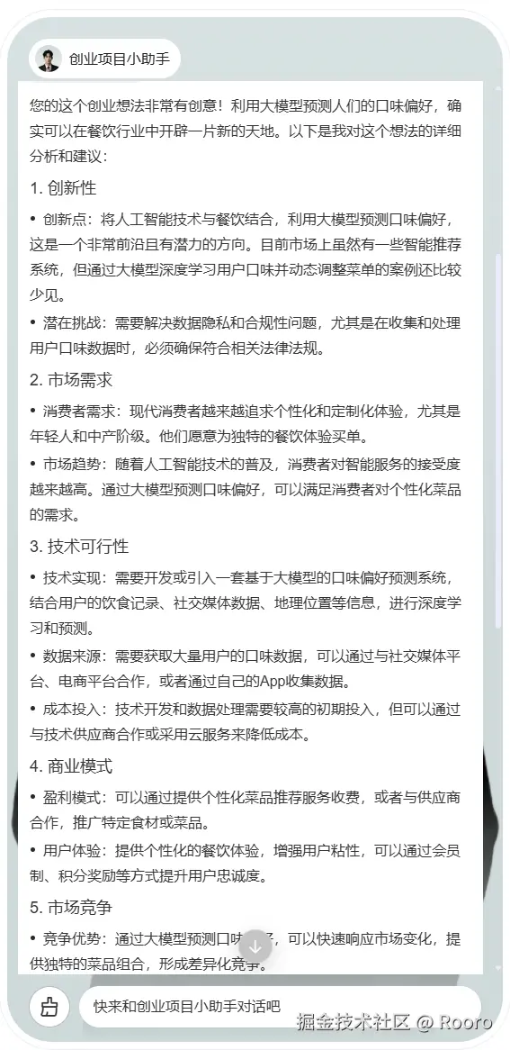 交互模式设计:创业项目的咨询往往不是一次对话就能完成的。交互模式设计支持多轮对话,用户可以根据智能体的回复进一步追问。例如,在智能体给出关于市场分析的建议后,用户若对某一竞争态势的细节不清楚,可继续提问 “您说的这个竞争对手,他们的营销策略具体有哪些特点?” 智能体持续与用户交互,逐步完善对创业项目的分析与指导,满足创业者在不同阶段的信息需求。