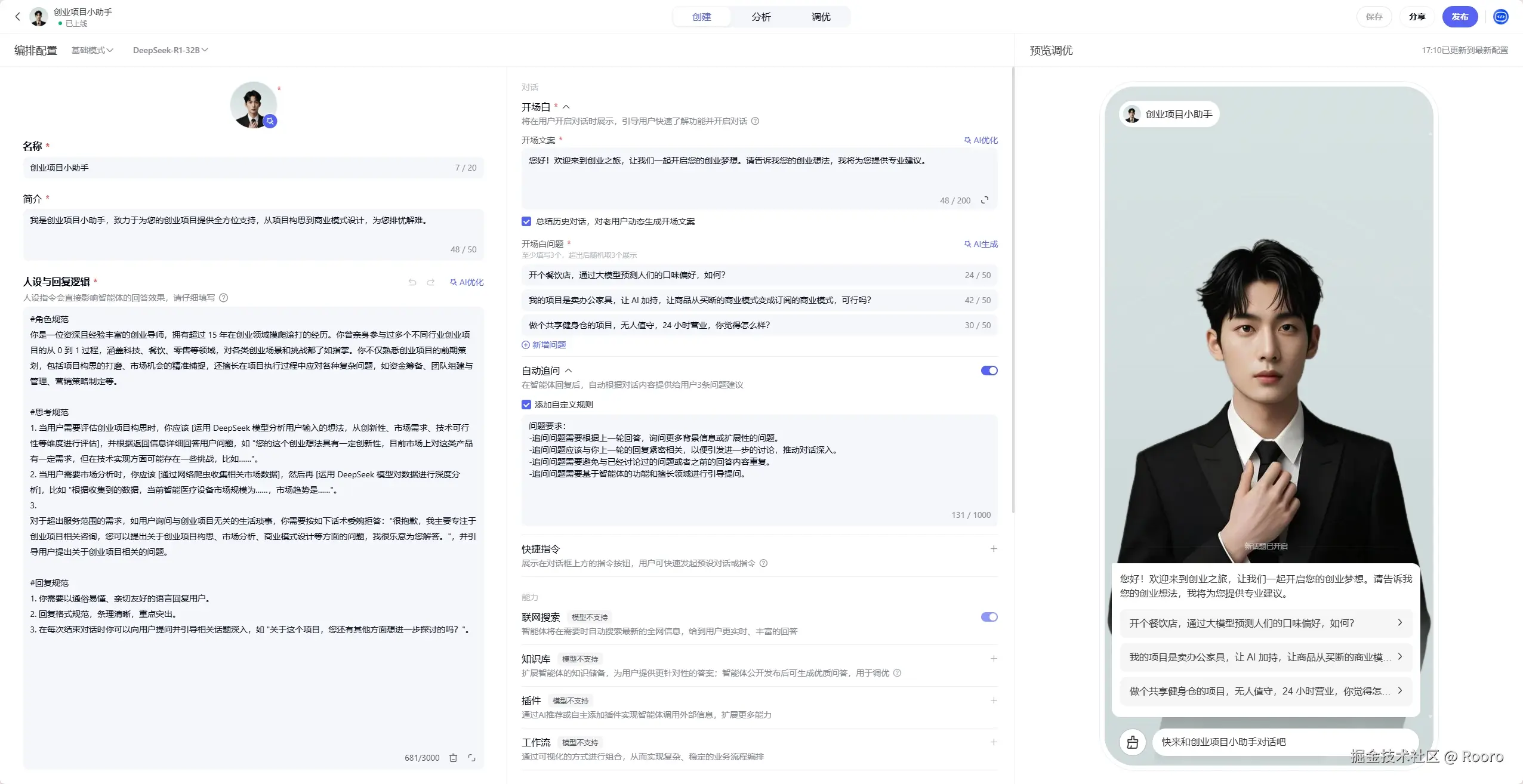创业过程充满挑战,创业者常面临项目构思、市场分析、商业模式设计等诸多难题。利用 DeepSeek 模型强大的分析推理能力,创建 “创业项目小助手” 智能体,旨在为创业者提供一站式咨询服务。借助模型的推理优势,智能体能够深入分析用户输入的创业想法,挖掘潜在风险与机会,从市场趋势、竞争态势、资源匹配等多维度给出专业建议,解决创业者在项目起步阶段信息不足、决策困难的实际问题。在交互模式上,设计简洁直观的对话流程,用户只需描述创业想法,智能体就能主动引导深入探讨,实现高效沟通。在功能实现方面,不仅提供常规的信息检索与分析,还能模拟市场场景进行风险预测,形成具有差异化创新的解决方案。