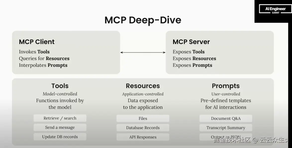 同样,用户客户端软件(它是 AI 应用程序本身的一部分)初始化一个会话,收集可用工具的列表。 它还维护对话上下文,执行查询并处理响应,并为用户提供命令行界面。