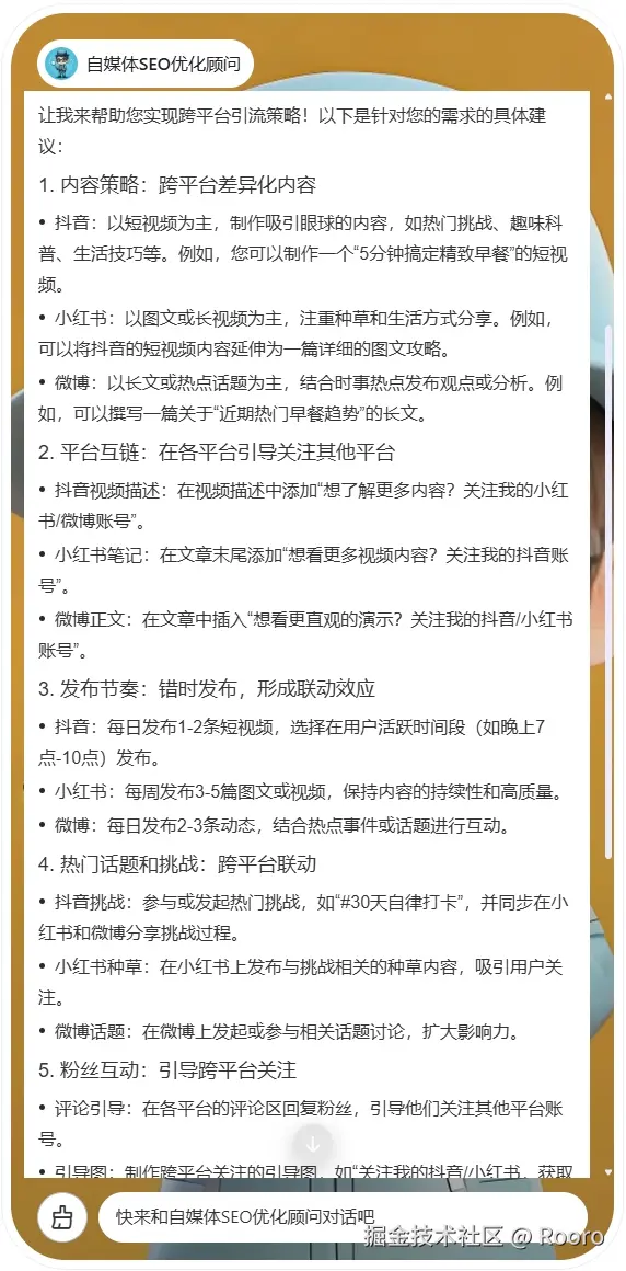 个性化页面优化:根据不同自媒体平台的内容格式特点,如公众号图文、小红书笔记、抖音视频文案等,智能体提供针对性的标题、正文排版、多媒体元素优化建议。通过优化,内容更易于阅读,同时满足搜索引擎抓取要求,提高内容曝光度。