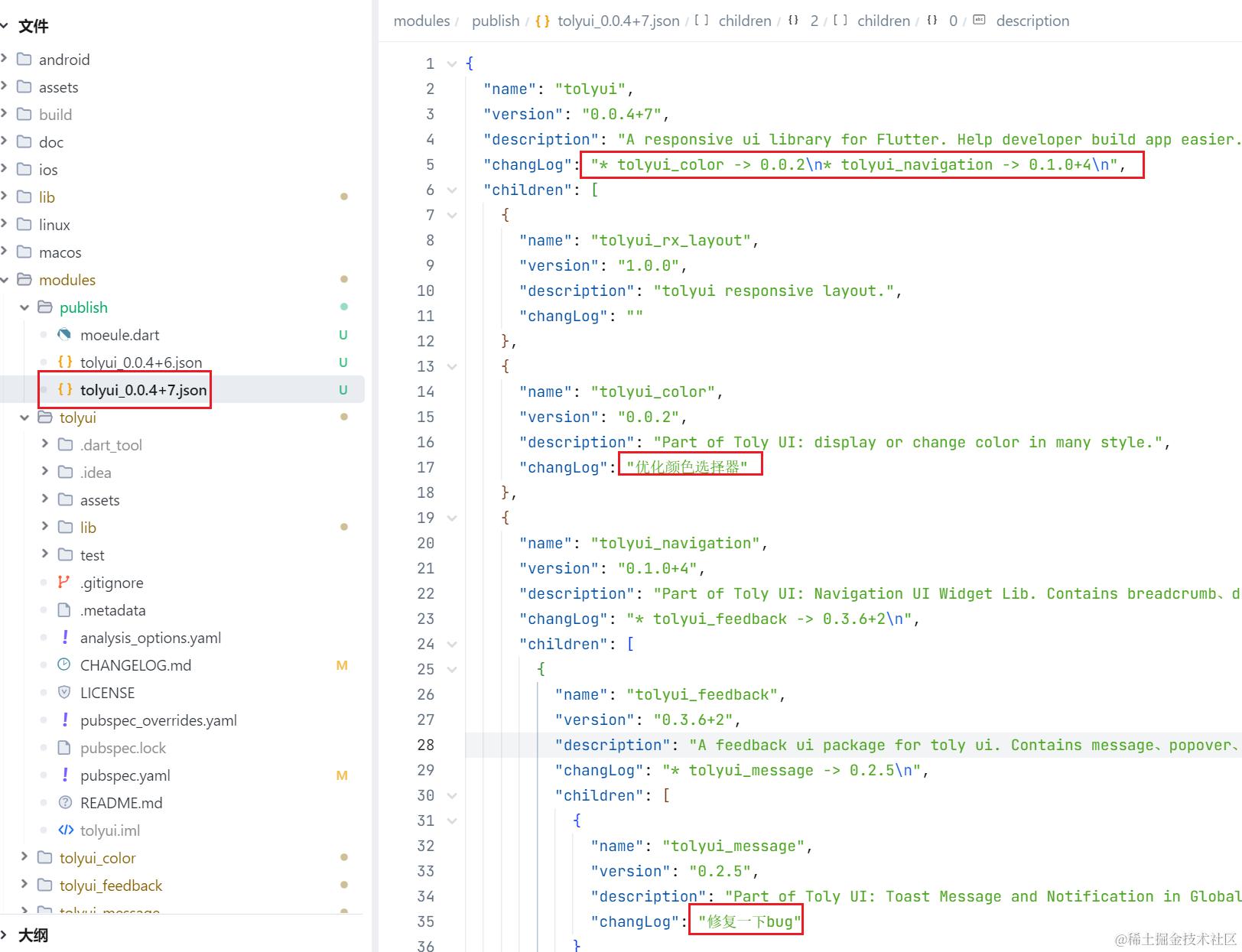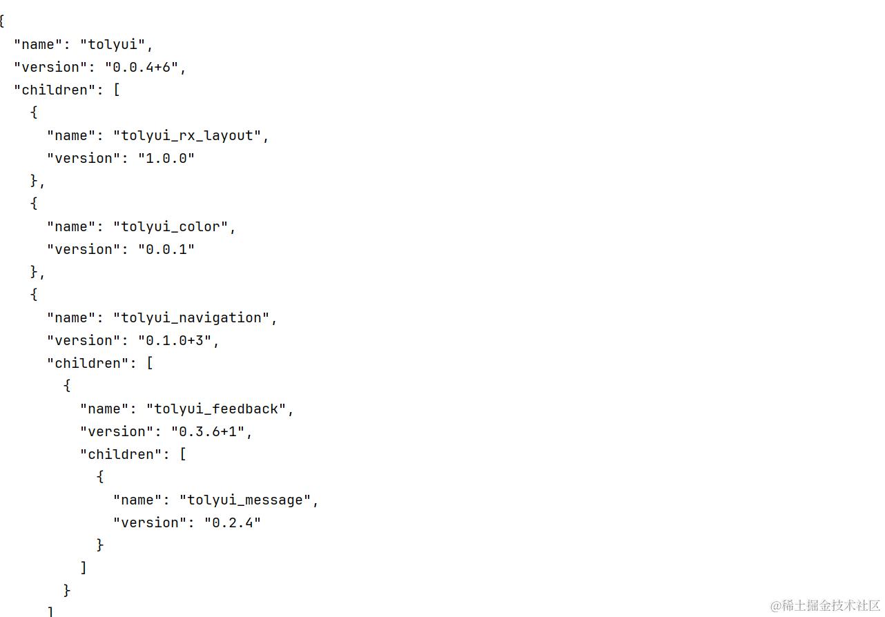 解析模块的方法 processModule 代码还不到 30 行,其中传入模块的文件夹路径,并读取其中的 pubspec.yaml ,然后通过 yaml 解析内容,得到名称版本、依赖库列表,当依赖以 tolyui_ 开头,则递归地分析子模块,并将解析结果添加到当前模块的 children 中;