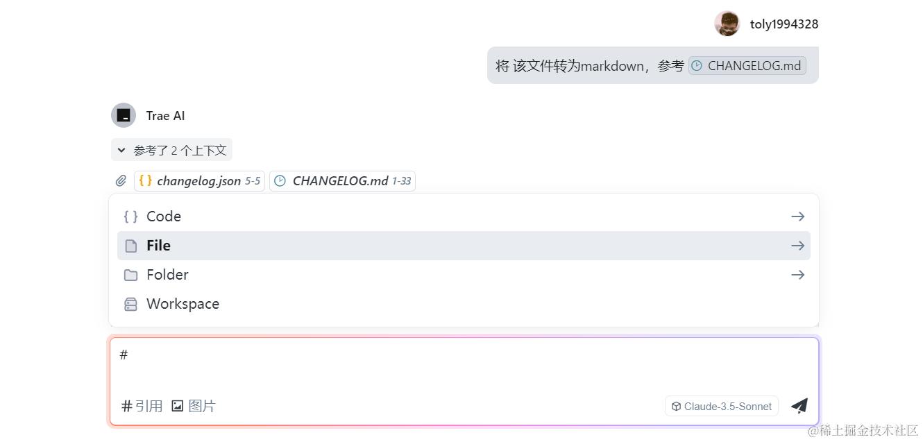 Trae 还有个比较好用的功能,可以选择关联的文件/夹, 比如这里让它根据 changelog.json 生成 CHANGELOG.md