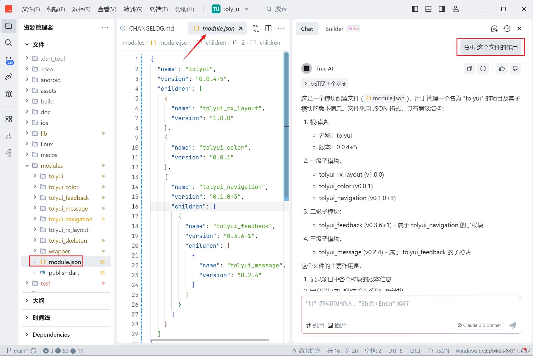 手动处理比较麻烦,所以我打算写个 Dart 脚本,来分析模块依赖结构。完成自动发布和展示当前所有模块信息的功能。刚好最近 Trae 发布了,就用它来帮我分析和书写一些代码: