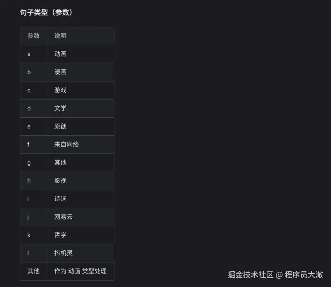 随机一句话 API,可以是动漫中的台词,也可以是网络上的各种小段子,创意思路很有趣,文档写的也不错,推荐!