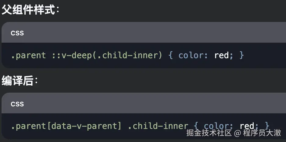子选择器不再检查自身父组件的哈希(data-v-parent),移除了子选择器的哈希限制,只需是父组件元素的后代即可,因此能穿透到子组件内部。