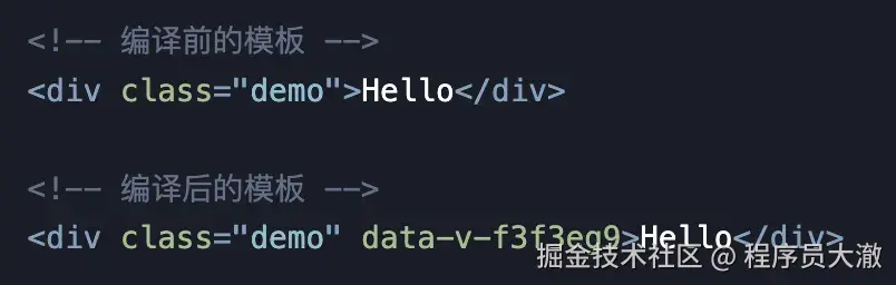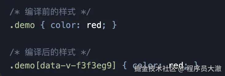 当组件使用 时,Vue 通过 PostCSS 插件,在编译时为该组件生成一个唯一的哈希值(如 data-v-f3f3eg9),并注入到组件模板的所有 HTML 元素上。