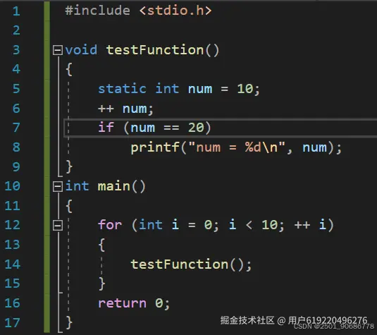所以说,就算我们在main函数中调用10次 testFunciton() 函数,num 变量也只会在main函数执行前初始化一次!并且 这个被 static 修饰的局部变量的生命周期是随进程的! 进程只要不死,这个变量永远都在(静态存储区中)。
