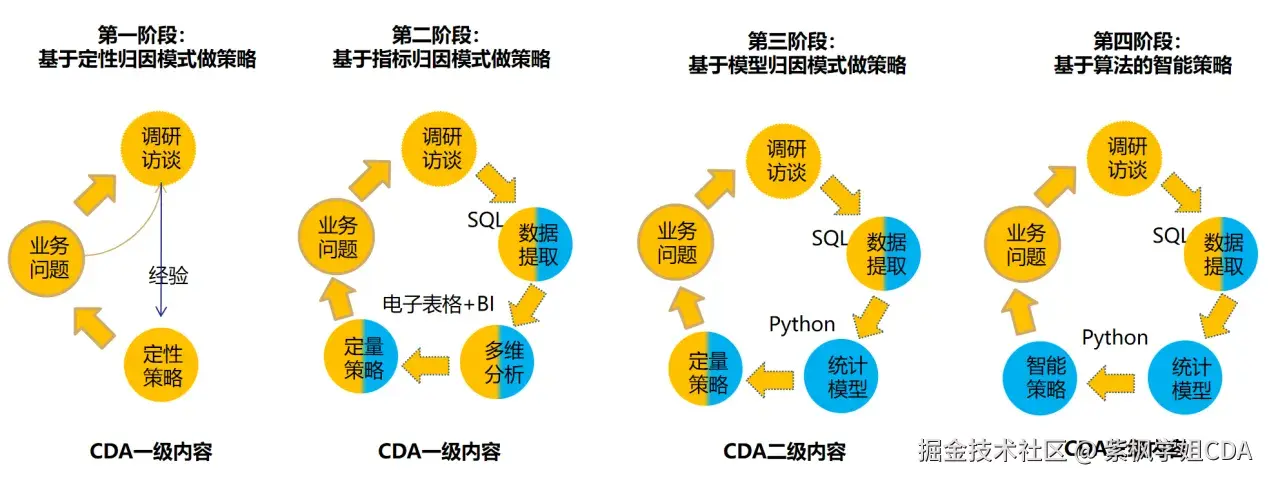 策略制定模式升级为基于指标归因的定量分析。数据分析师在调研访谈的基础上,利用SQL提取数据,并通过电子表格和BI工具进行多维透视和指标拆解,深入分析业务问题的根源,这个阶段属于CDA一级后期。这一阶段的策略制定更加数据驱动,能够通过量化分析精准定位问题,并制定更具针对性的策略。工具使用上,除了SQL和BI工具,Python编程开始引入,用于更复杂的数据处理和分析。 -