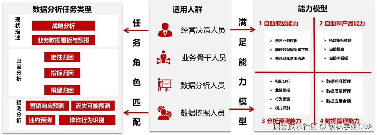 CDA认证考试体系围绕一套全面的数据人才能力模型展开,旨在培养能够胜任企业数据分析任务的专业人才。
