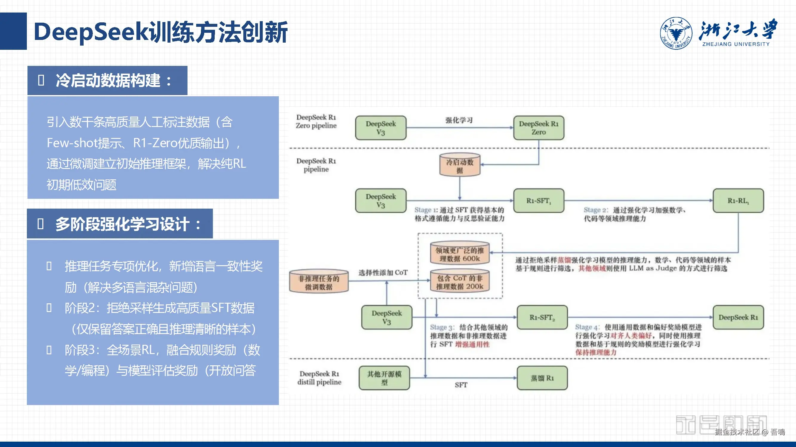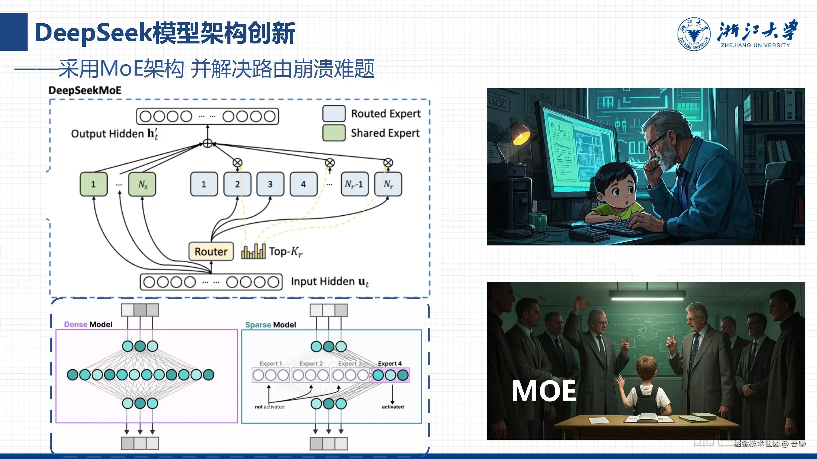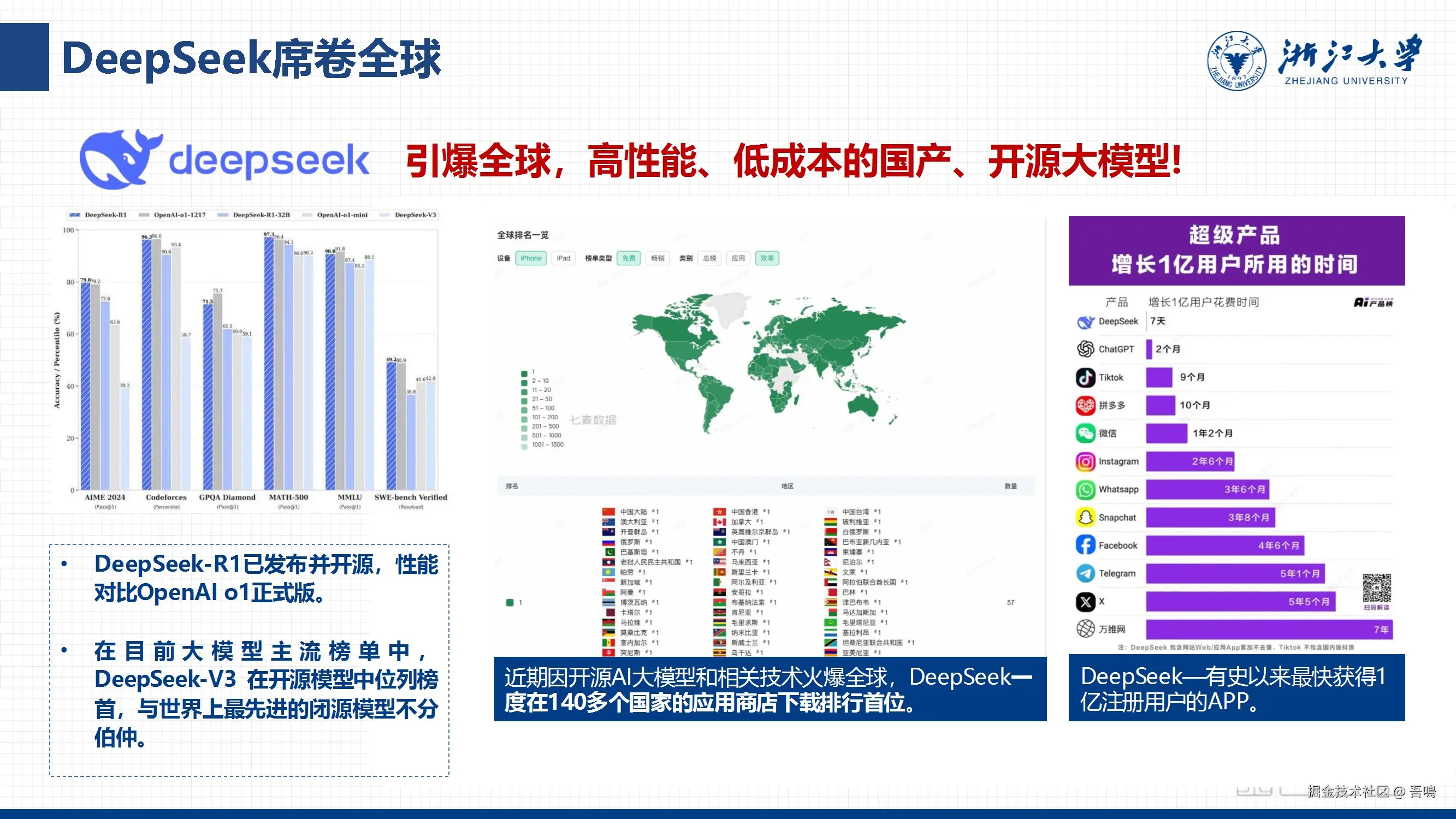 今天吾鳴给大家分享一份由浙江大学出品的第三份报告——《Chatting or Acting?DeepSeek的突破边界与浙大先生的未来图景》。报告主要从DeepSeek的技术创新与架构、性能优势与全球影响力、从大模型到智能体的进化、教育领域的深度整合——“浙大先生”、未来场景与生态建设以及战略趋势与行业影响等六个方面全面的介绍了DeepSeek。报告一共85页PPT,文末有完整版下载地址。
