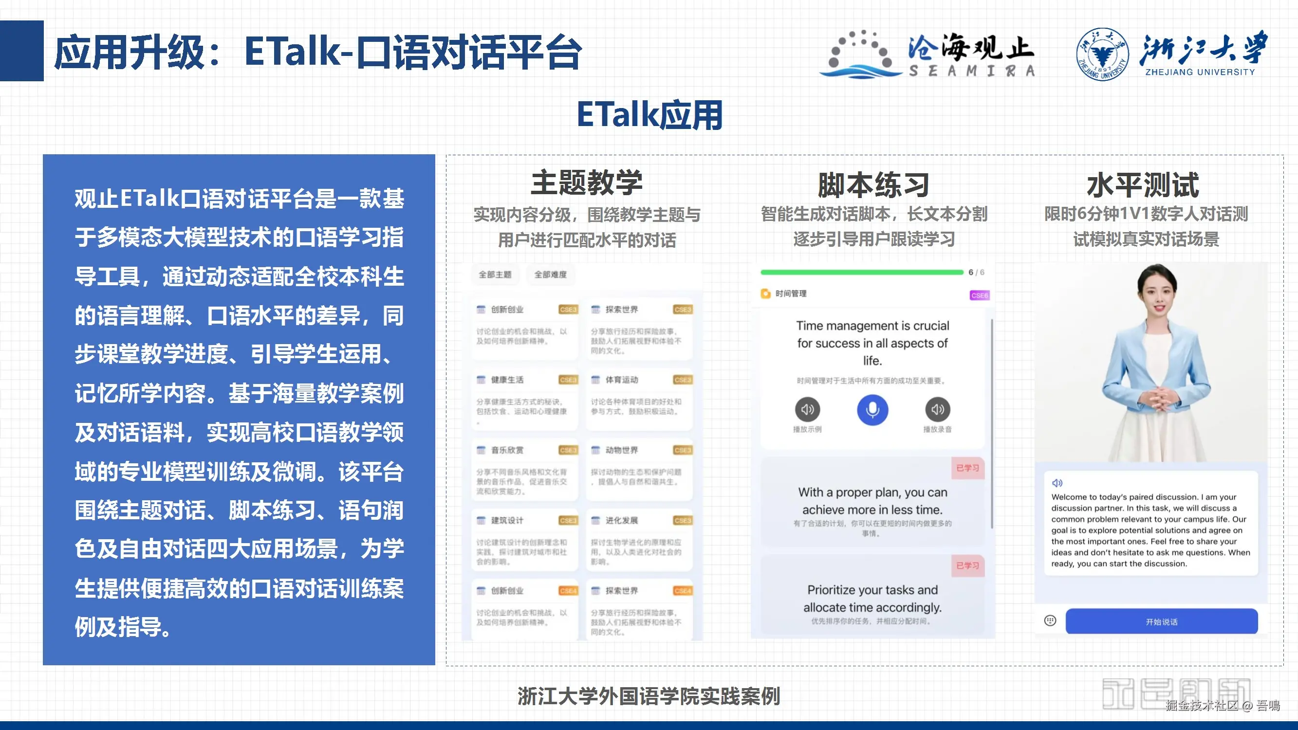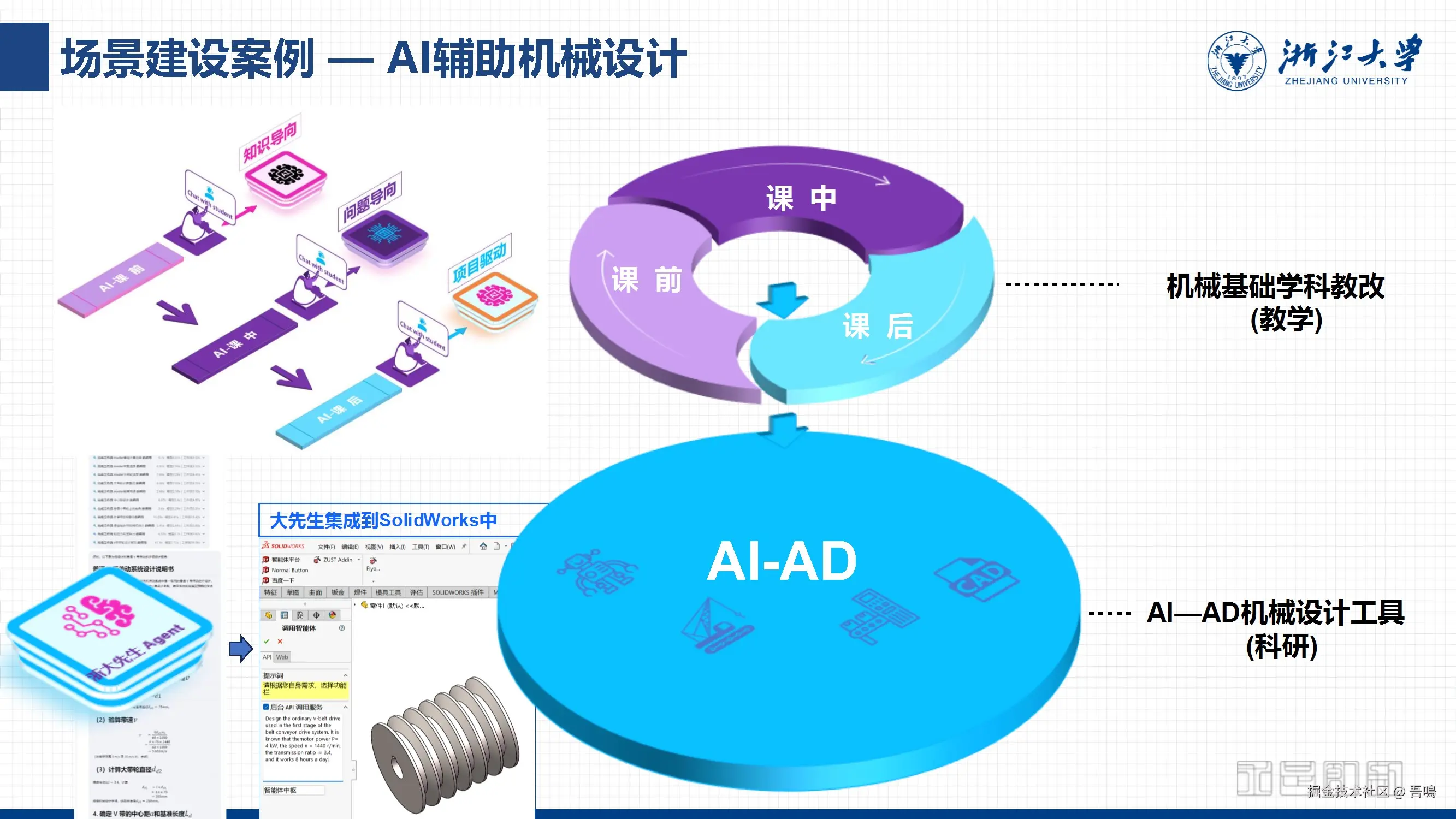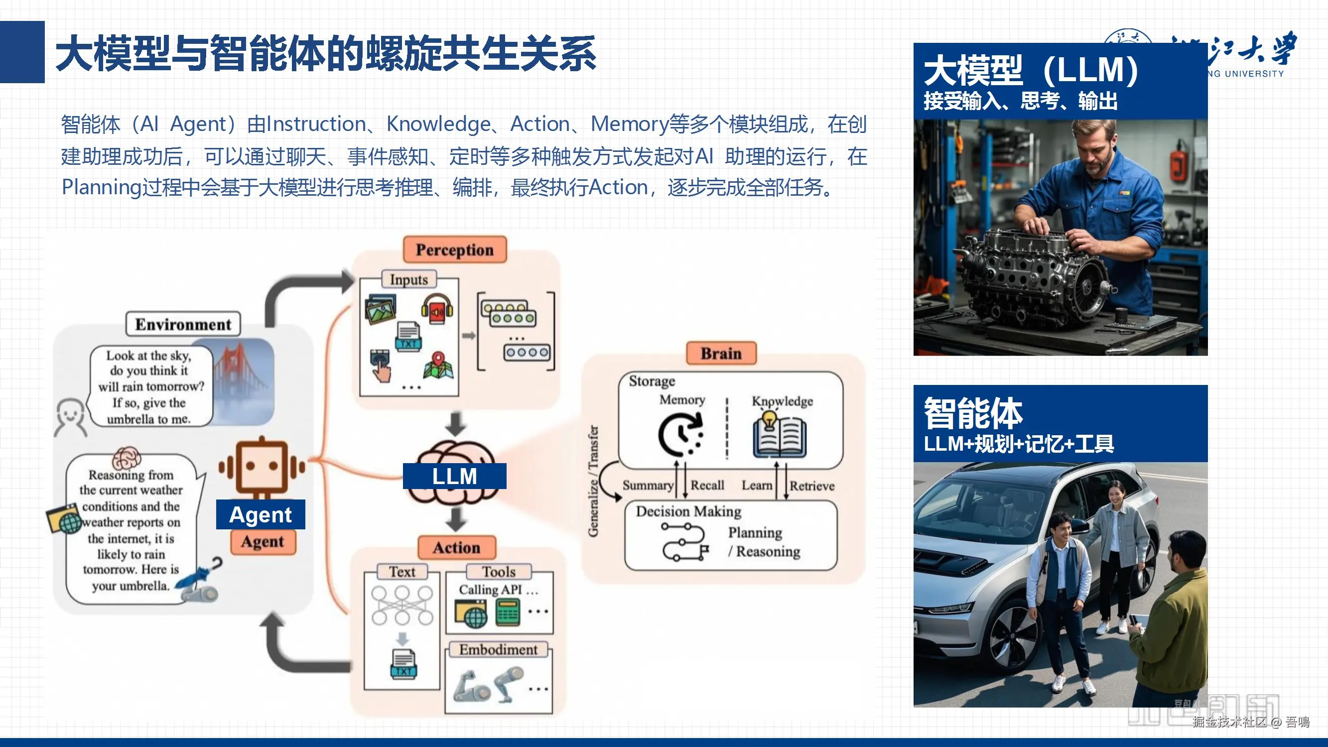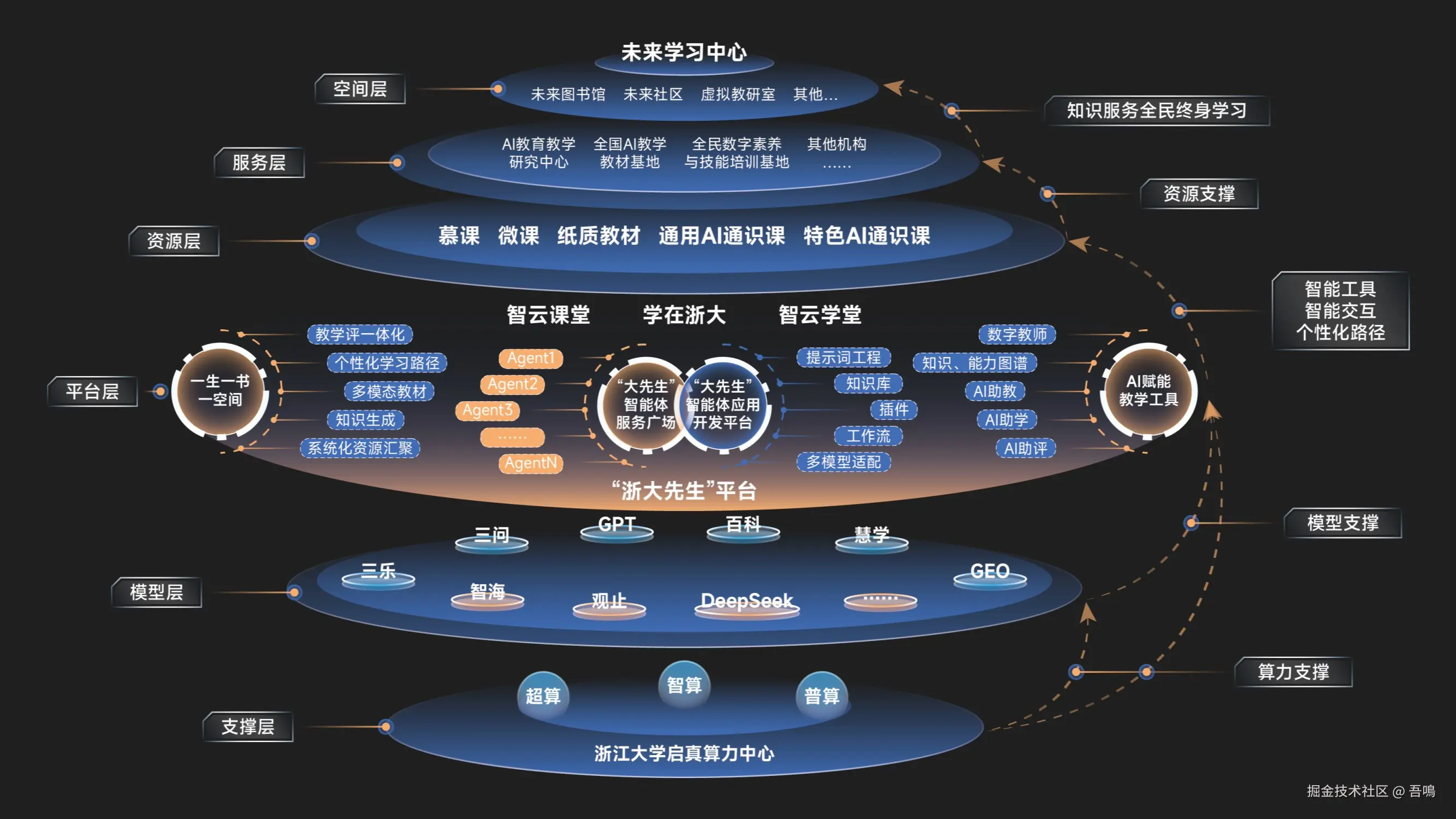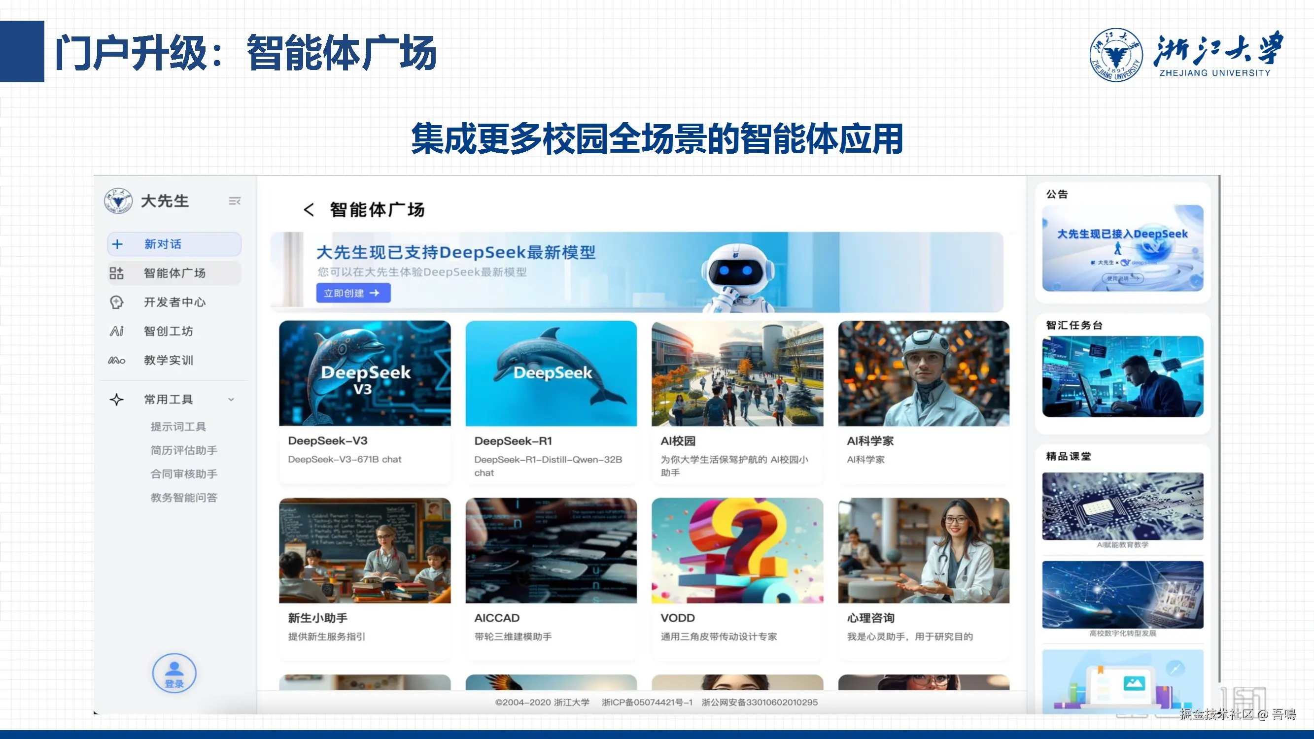 分析LLM(大语言模型)的局限,提出智能体(Agent)需具备自主决策、多模态交互、长期记忆等能力,并设计开发平台支持不同复杂度智能体的构建(如青铜级到王者级应用)。强调智能体在任务执行、个性化服务、系统整合等场景的核心作用。 - 教育领域的深度整合——“浙大先生”