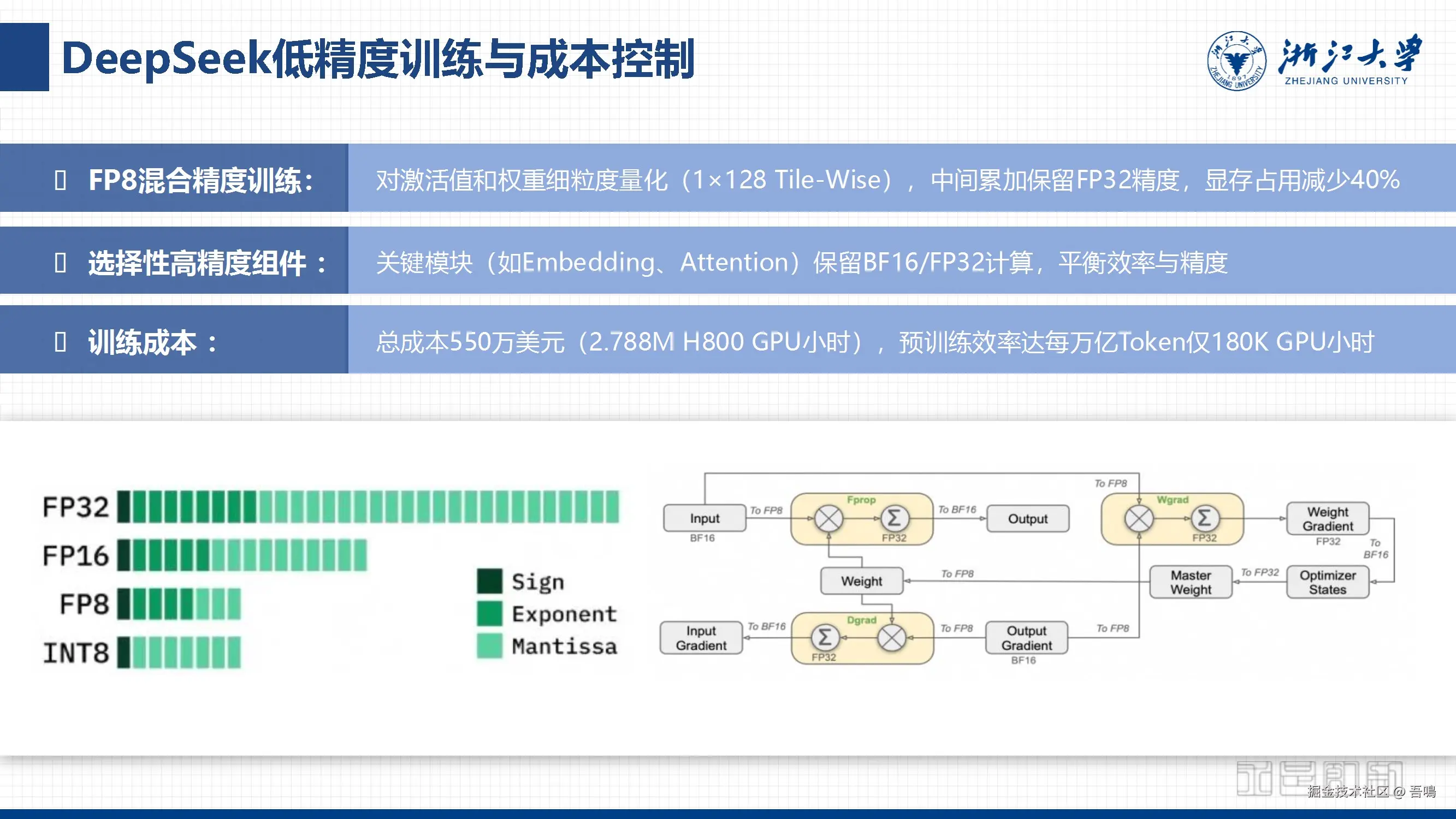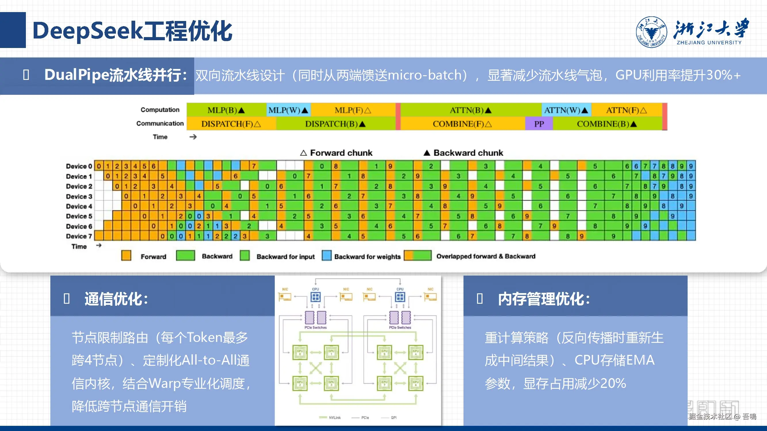 重点介绍DeepSeek的模型架构,包括MoE(混合专家)架构、MLA(多头潜在注意力)机制,以及工程优化策略(如流水线并行、通信优化、内存管理)。通过多Token预测、长上下文扩展等技术提升训练效率和推理性能,同时采用FP8混合精度训练降低成本。 - 性能优势与全球影响力