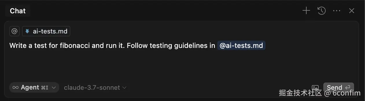 你需要使用代理模式(cmd + I)+ Claude 3.7 sonnet(注意左下角的小下拉菜单)。代理模式将持续调用 Claude 直到目标实现。因此,它会搜索文件,查找更多上下文,运行测试,安装包等。