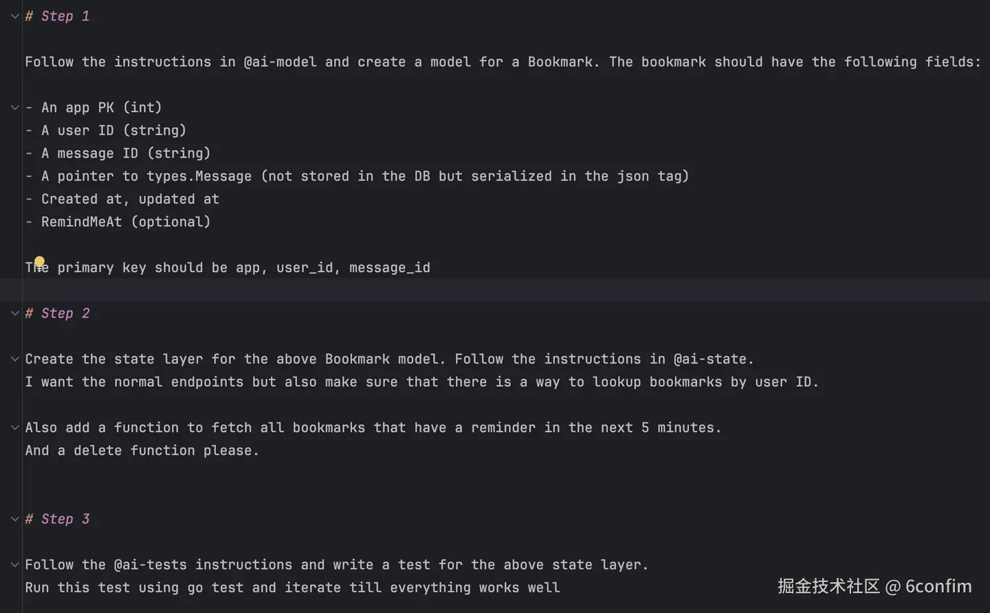 注意每个步骤如何引用相关文档。你也可以使用 Cursor 规则来做这件事,但我更喜欢大多数时候手动指定正确的文档。