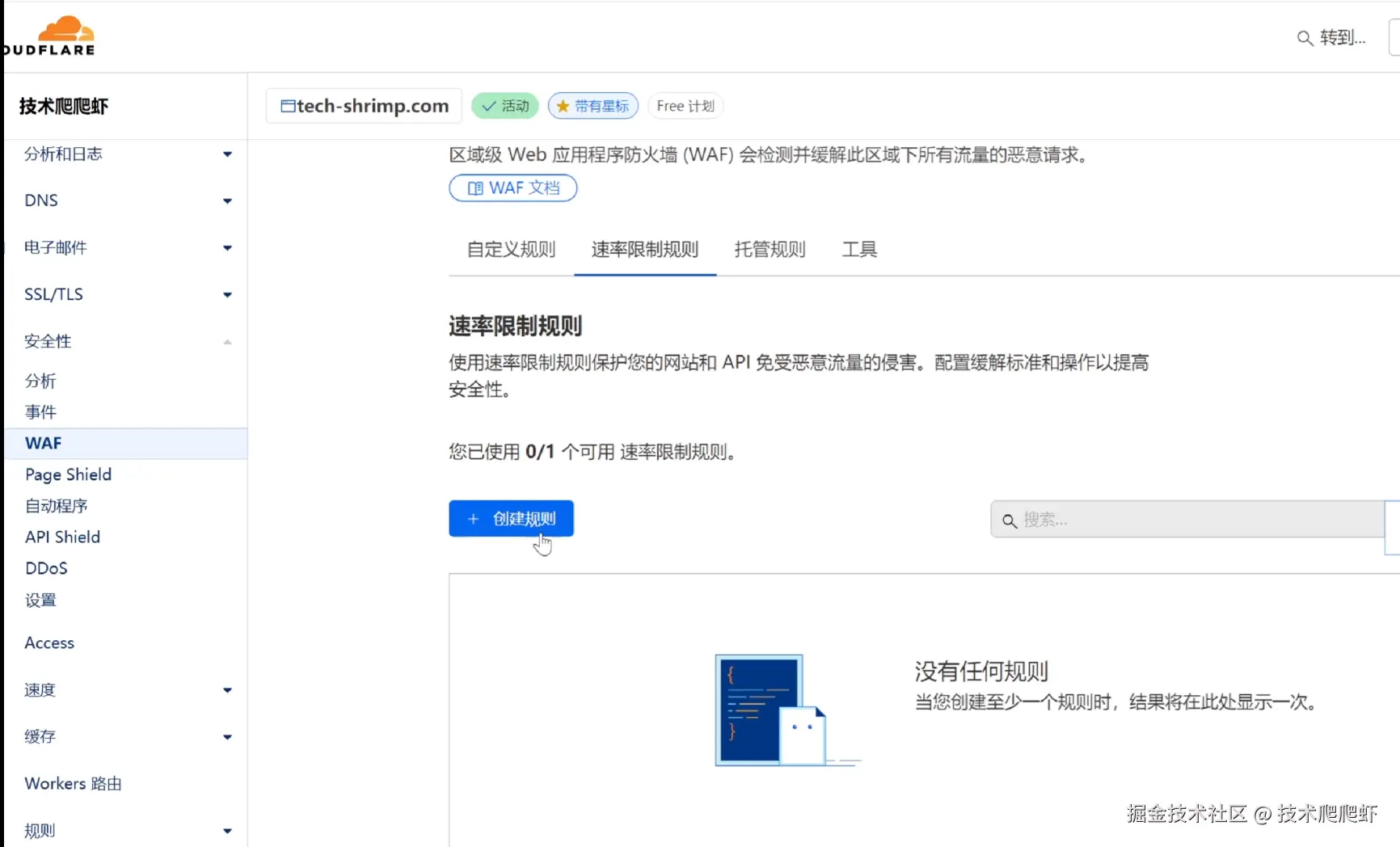接下来,我们来看使用Cloudflare的免费防火墙为我们的应用层增加抗DDoS攻击的能力。这里我们找到自己的域名,找到这里的安全性,我们进入这里的WAF。进来以后我们点击自定义规则,免费用户可以自定义5个防火墙规则,我们来看几个比较有用的。