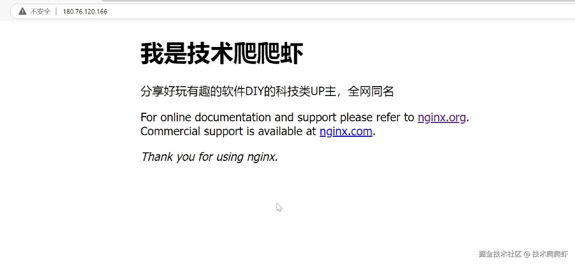 好,我们进入实战环节。这是我的一台云服务器,然后我在上面安装了一个nginx。我使用nginx部署了一个页面,我们在浏览器输入服务器的IP地址,就可以访问到我这个最基础的小网站。