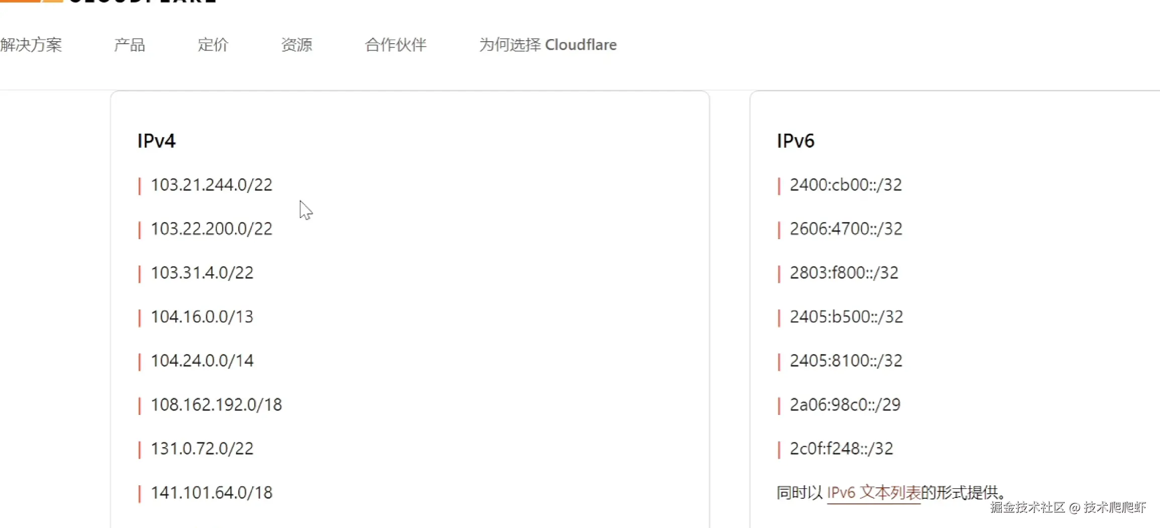 我们进入这个地址, www.cloudflare.com/ips/ 这里面的IP地址就是Cloudflare所有的CDN节点的IP地址。