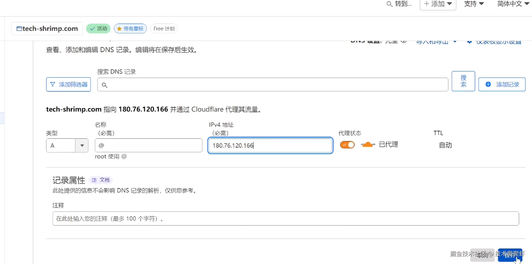 我们有了域名以后,这里点击DNS记录。接下来我们配置一个DNS解析,把我的域名指向我的网站。这里点击添加记录,名称的话我填@,指的是把我的域名解析到这个IP地址。IP地址就填服务器的IP地址。好,这一步是重点,我们要把这个代理状态,也就是这个小黄云开启。