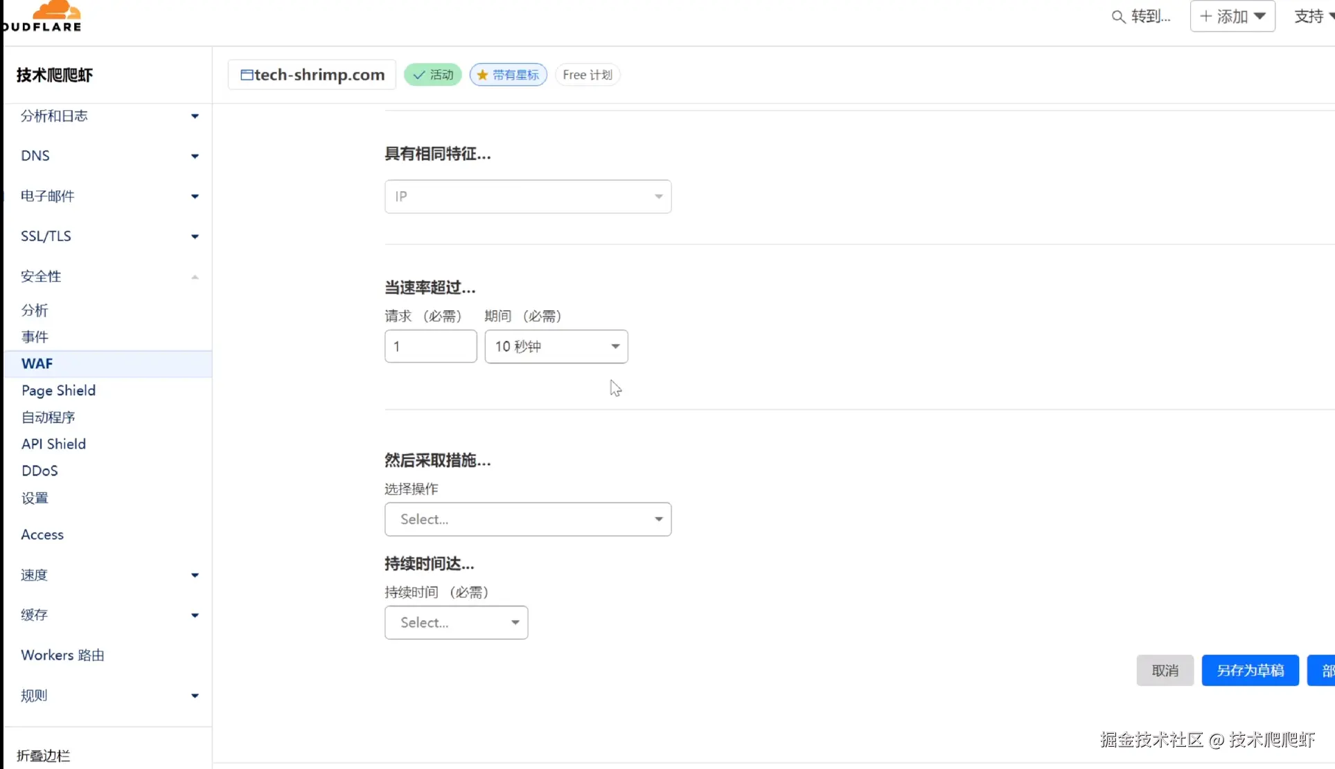 我们来点击创建规则,这里我叫IP访问限制,这里我们填URL路径,然后来一个通配符,这里我直接星号,指的是保护整个网站。接下来具有相同特征,那就是IP地址,免费版是没法改的,然后这里可以填写一个自定义的速率,比如这里我填写1,然后选择10秒钟,指的是同IP每10秒钟只能请求一次,然后采取措施,这里直接阻止,最后时间是10秒。