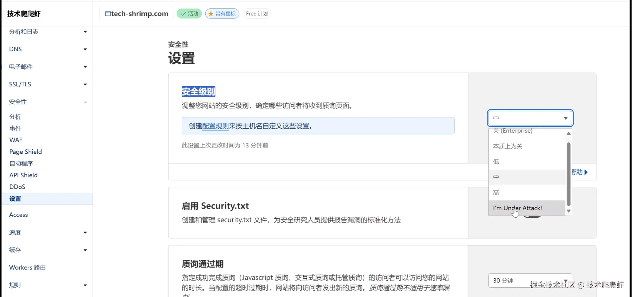 Cloudflare的安全性设置里面还有一个大招,就是这里的安全级别,可以把这个安全级别调成最高,叫做I'm under attack。