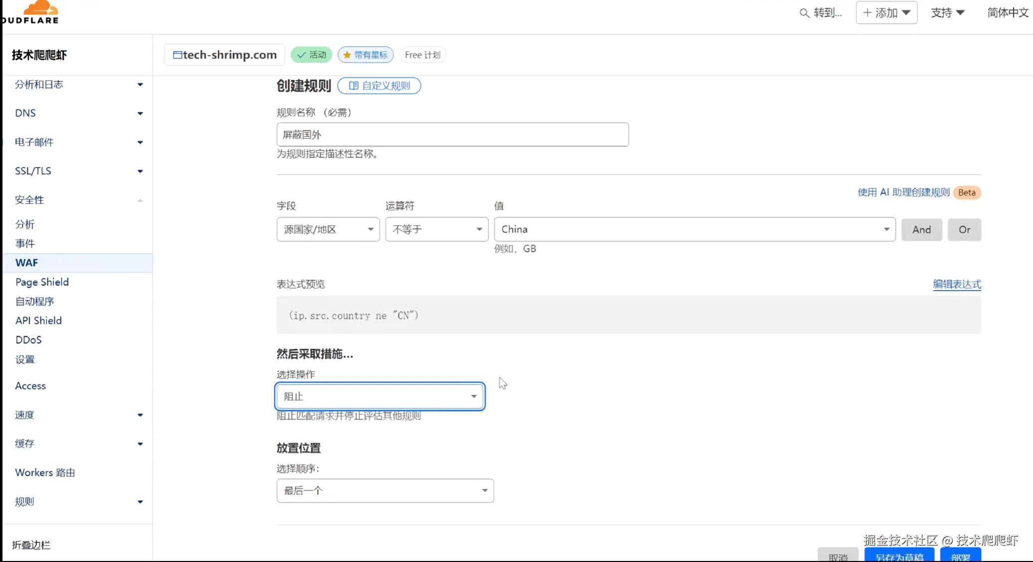 我们还可以再添加规则,比如这里我添加一个规则叫做屏蔽国外,然后客户的地址只要是不等于中国,我们还可以采取措施,比如这里阻止。这里指的是所有国外的请求都会被Cloudflare的规则阻止。我们可以通过分析黑客的DDoS攻击的来源,使用防火墙规则挡住大部分DDoS攻击。具体规则如何配置,可以参考Cloudflare的文档。