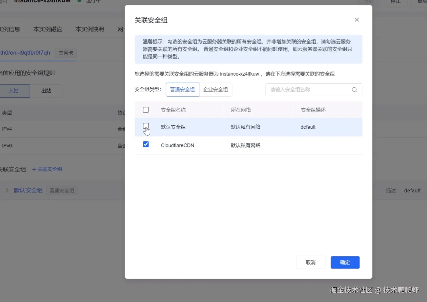 现在使用的是默认安全组,我们点击这个加号关联安全组,我把Cloudflare CDN安全组选中,