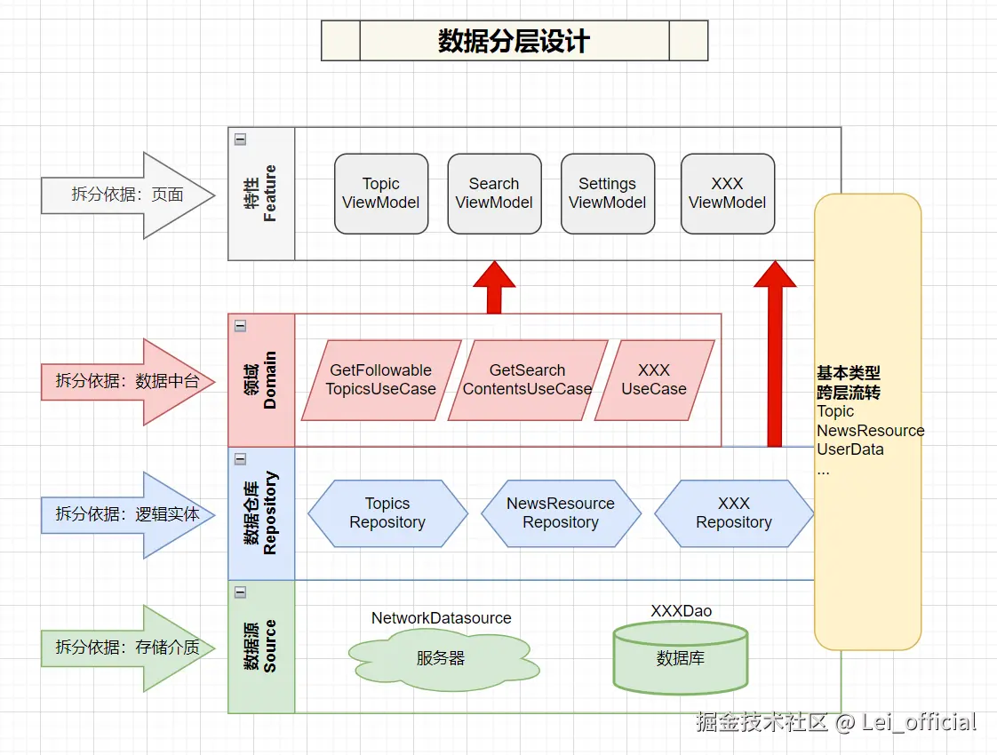 | 数据源Source | 数据的存储方式,如服务器、数据库、文件 | 单例,NetworkDataSource(服务器)、XXXDao(数据库),以Bean作为函数返回 |