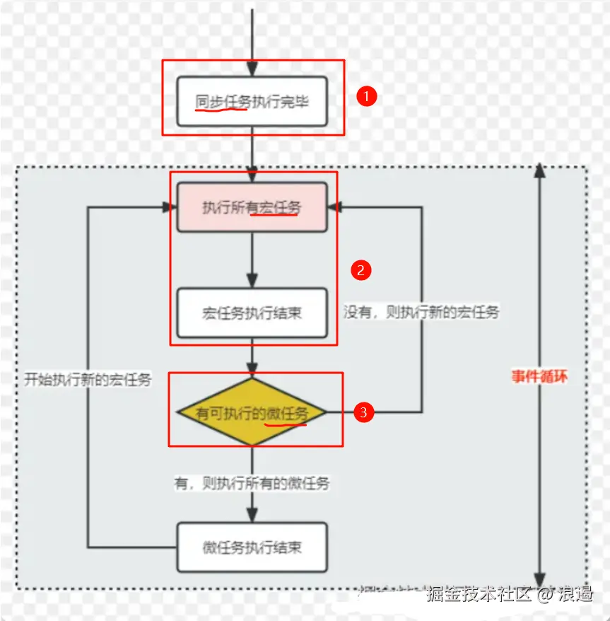 - 循环 :宏任务 => 微任务 , 没有微任务继续执行宏任务