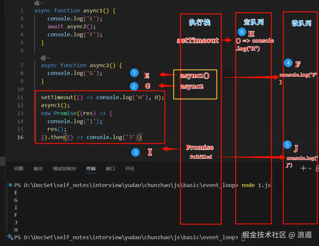 然后遇到 await async2(); ,先执行 async2 函数, async2 函数中 console.log('G'); ,输出 G 。此时 await 会暂停 async1 函数的执行,将 async1 函数中 await 后面的代码( console.log('F'); )放入微任务队列中。