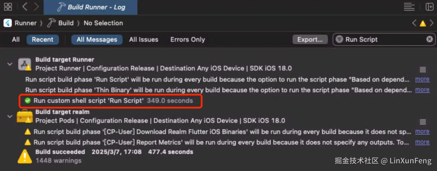 通过 Xcode 自身去查看编译耗时会发现最长的是 Run Script,其主要负责编译 Flutter 侧的代码。