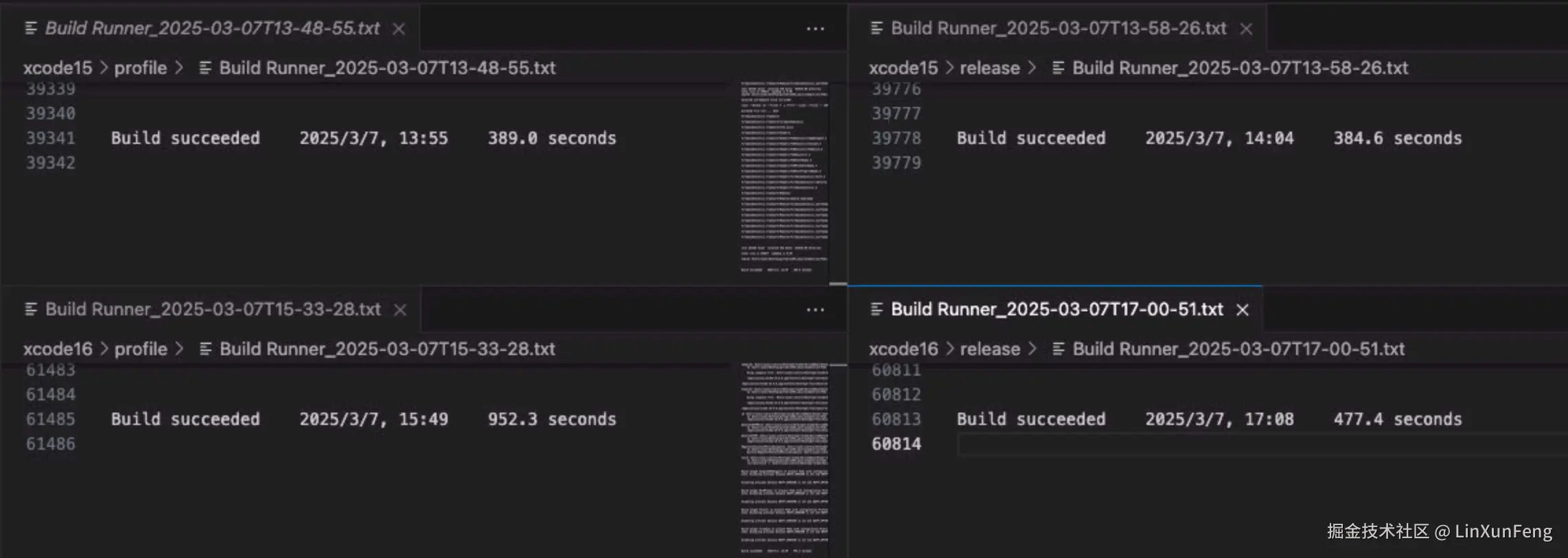 这种情况在退回 Xcode 15 是可以解决的,但是这并不是长久之计,因为苹果早晚会强制要求升级的,好在申请了台 M4 Mac Mini 来打包,时间来到了 15 分钟,不过随着业务功能不断迭代,构建时间也慢慢增加,目前来到了 17、18分钟,但一旦哪天对 M4 构建机进行维护,让 i7 和 M1 顶上时,再加上多个打包任务并行,完成打包的时间动不动就得 半小时 起步,真的很令人绝望~