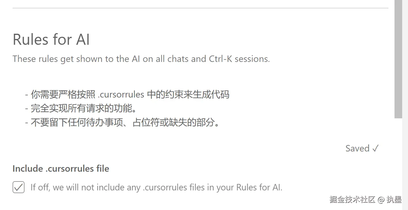 但需要注意的一点是:尽量不要写太多的内容到 cursorrules 文件中,内容太多的话,AI 不会全部理解,而是会做后续内容的截断。