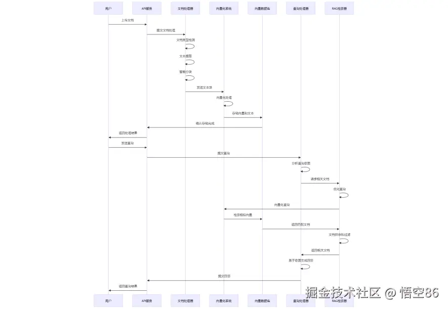 各模块间的交互是RAG系统的关键,以下时序图展示了完整工作流程:
