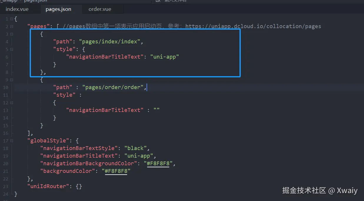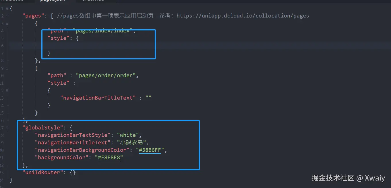 - pages:配置单个页面,path是页面的所在路径,style是它的样式配置。