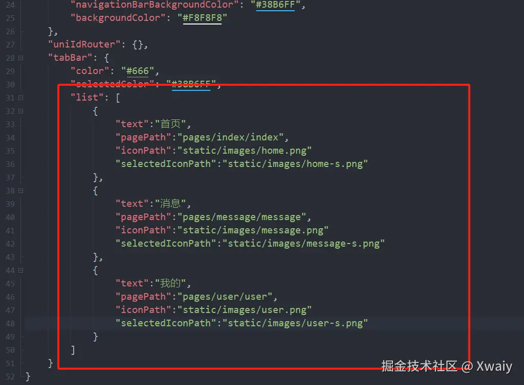 tabBar中的list是个数组,最少2个、最多5个tab,按数组顺序排序。