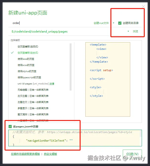 在HBuilderX中新建页面,会自动创建同名目录,并在pages.json中添加配置。