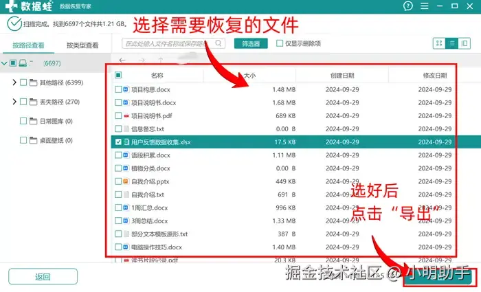 步骤2:扫描结束后,用户可以在软件的指定位置上选择需要恢复的目标文件;勾选好后点击“导出”;
