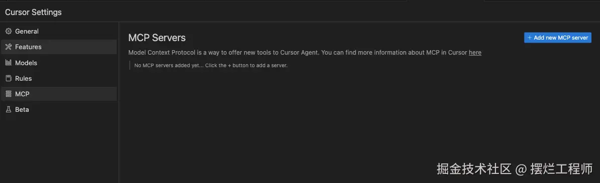 在Cursor的设置中,找到“MCP”选项,然后输入你的MCP服务器地址(比如运行在本地的server.py)。具体配置可以参考Cursor的官方文档。 -