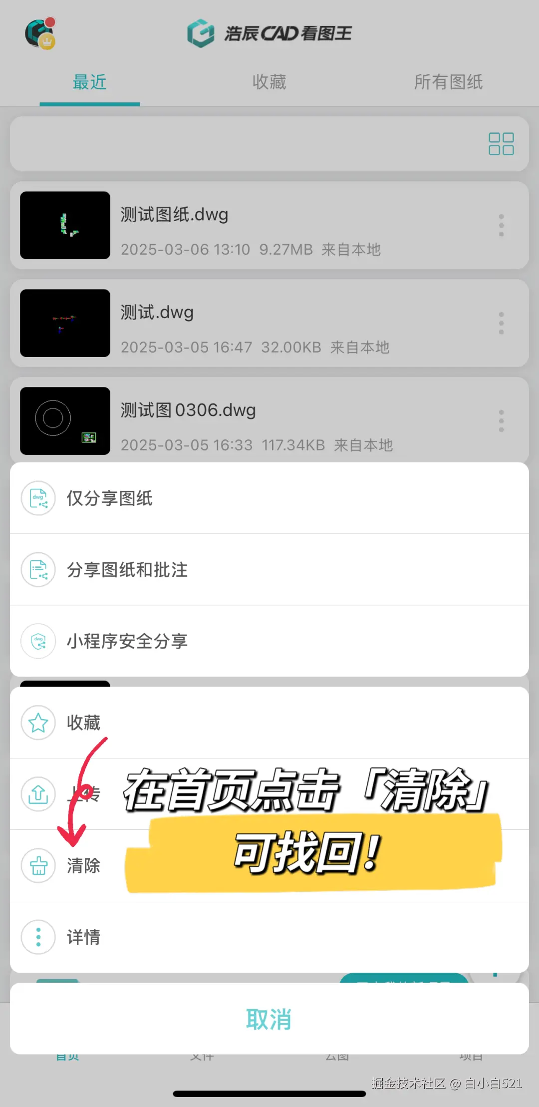 ① 如果您是在软件首页长按图纸名称点击 【清除】 误删的图纸,此类删除图纸是可以被追回;