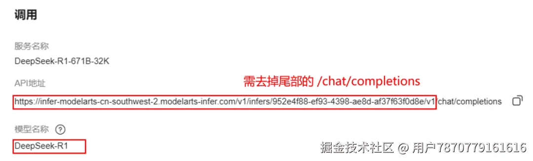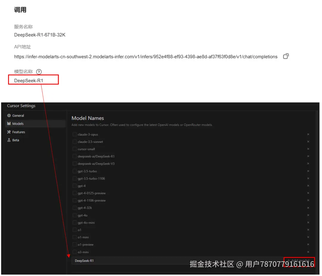 在右侧弹出界面中,可以查看到调用该服务需要的基础API地址和模型名称信息,后续Cursor中配置要用到。