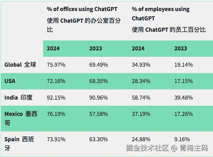 结果显示,截至 2024 年 12 月,全球 75.9% 的办公室已将 ChatGPT 整合到工作流程中,其中印度的采用率最高,达到 92%。