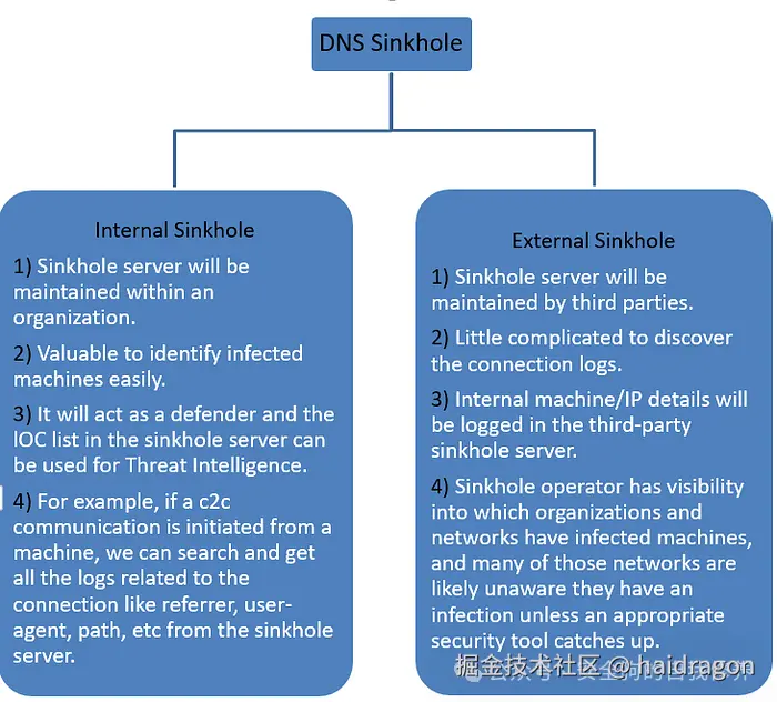 - 如果 Sinkhole 服务器在组织内维护,则应隔离服务器或在 DMZ 中。这样攻击者可能就不知道缓解措施。否则,攻击者可能会尝试执行反向 DNS 来更改服务器中的 IP。
