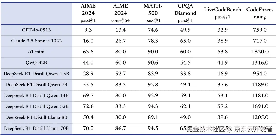 通过 DeepSeek-R1 的输出,蒸馏了 6 个小模型开源给社区,其中 32B 和 70B 模型在多项能力上实现了对标 OpenAI o1-mini 的效果。